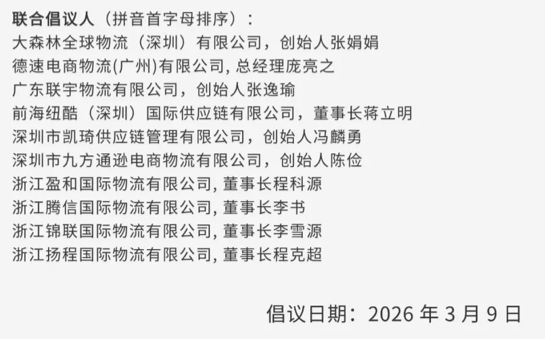 初海视野发现,此封倡议书是由10家头部物流公司发起,包括大森林、德速电商、联宇物流、前海纽酷、凯琦供应链、九方通逊、盈和国际、腾信国际、锦联国际、扬程国际。